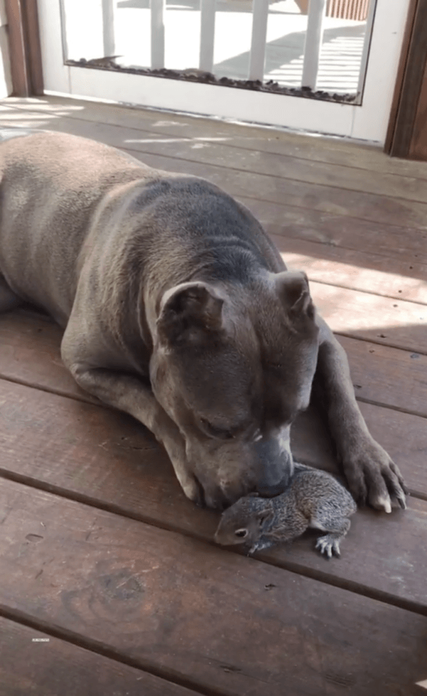The squirrel was fascinated by the gentle pitbull and even follower her home. Soon, they started hanging out and even became best friends.