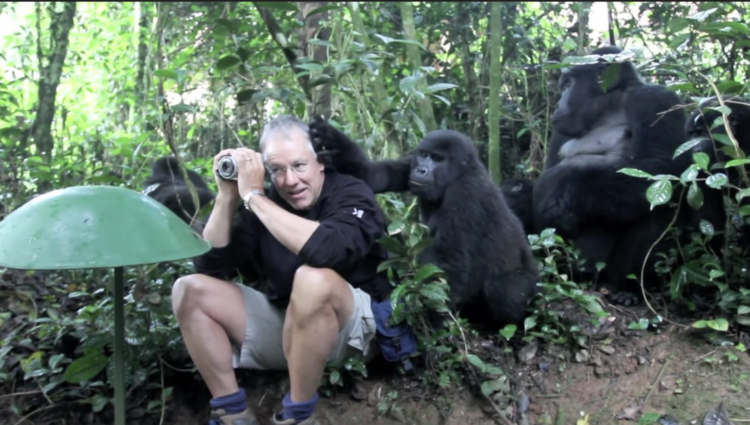 “Instead of moving away, it went behind me and started to touch me on the shoulder and on the head in what was obviously grooming,” he said. “When the silverback walked up, I was transfixed and really set upon not engaging his eyes and trying to be docile.”